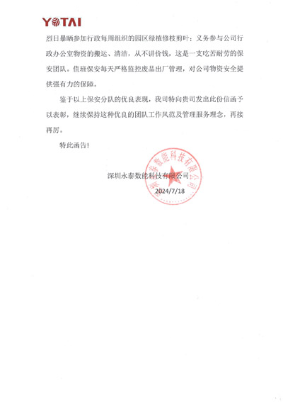 深圳永泰數能科技有限公司致信表揚我司鐵保宏泰深圳保安公司保安隊長鄧芝芳同志工作認真負責,有極高的責任感。特致信提出表揚及辦法優秀團隊獎榮譽證書。