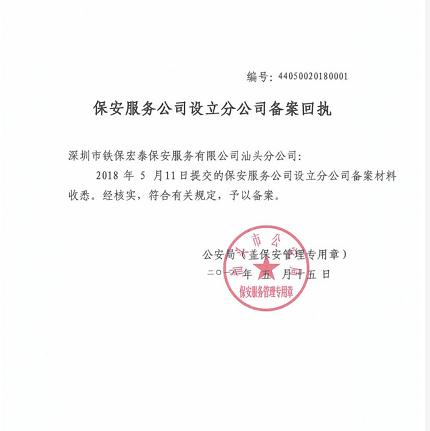 2018年5月11日提交的保安服務公司設立分公司備案材料收悉。經核實,符合有關規定,予以備案。