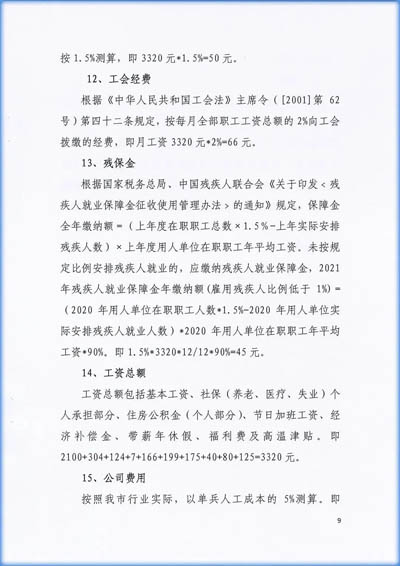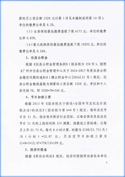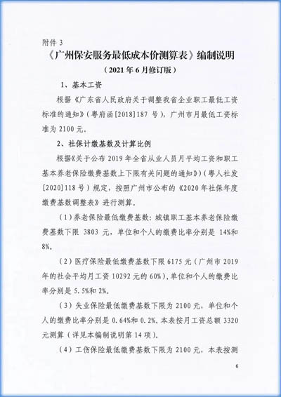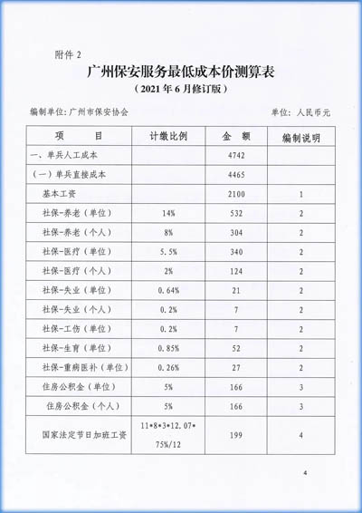 《廣州市保安服務最低成本價標準(2021年6月修訂版)》是根據《廣東省人民政府關于調整我省企業職工最低工資標準的通知》(粵府函[2018]187號)、廣州市公布的社會保險和住房公積金繳費基數下限,結合我市行業實際測算確定。根據測算,廣州市保安服務最低成本價標準為4992元/月/人(每周5天8小時工作制,含保安員在11天法定節日的3/4上崗時間的加班費用)。