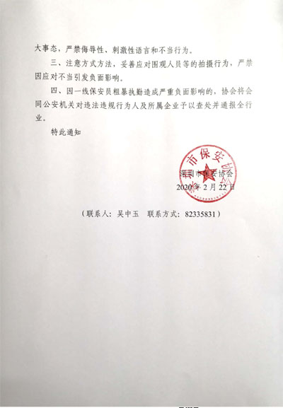 四、因一線保安員粗暴執(zhí)勤造成嚴(yán)重負(fù)面影響的,協(xié)會(huì)將會(huì)同公安機(jī)關(guān)對違法違規(guī)行為人及所屬企業(yè)予以查處并通報(bào)全行業(yè)。